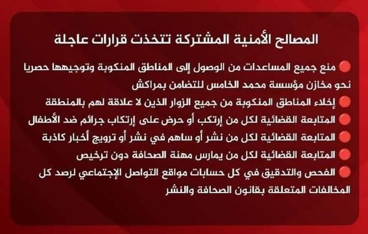 في خطوة قوية كانت منتظرة مند وقوع الزلزال اصدرت وزارة الداخلية تعليمات مشددة الى رجالات السلطة والامن للتدقيق في منتحلي الصفة مع تقديمهم للعدالة. وياتي قرار وزارة الداخلية بعد استفحال ظاهرة الصحافيين المزورين وقيامهم بتصوير اشرطة فيديو واستجواب بعض اسر ضحايا الزلزال الذي ضرب منطقة الحوز وخلف ضحايا وجرحى دون ان تكون لهم الصفة ناهيك عن انتشار شائعات واخبار زائفة. وزارة الداخلية عملت ايضا على اخلاء المنطقة وتوجيه المساعدة الى مخازن خاصة في مراكش تجنبا للاكتضاض وعرقة التدخلات للبحث عن الناجين وسط الأنقاض.