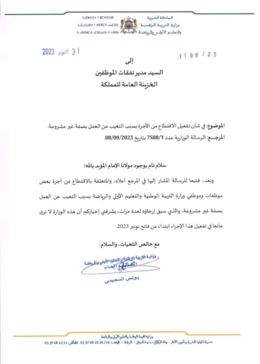 تتجه وزارة التربية الوطنية الى تفعيل قرار الاقتطاع في حق رجال التعليم المضربين عن العمل مند قرابة الاسبوعين و تعطلت الدراسة في اغلب المستويات بسبب النظام الاساسي الذي رفضته باقي النقابات لانه لا يستجيب لتطلعات اسرة التعليم.